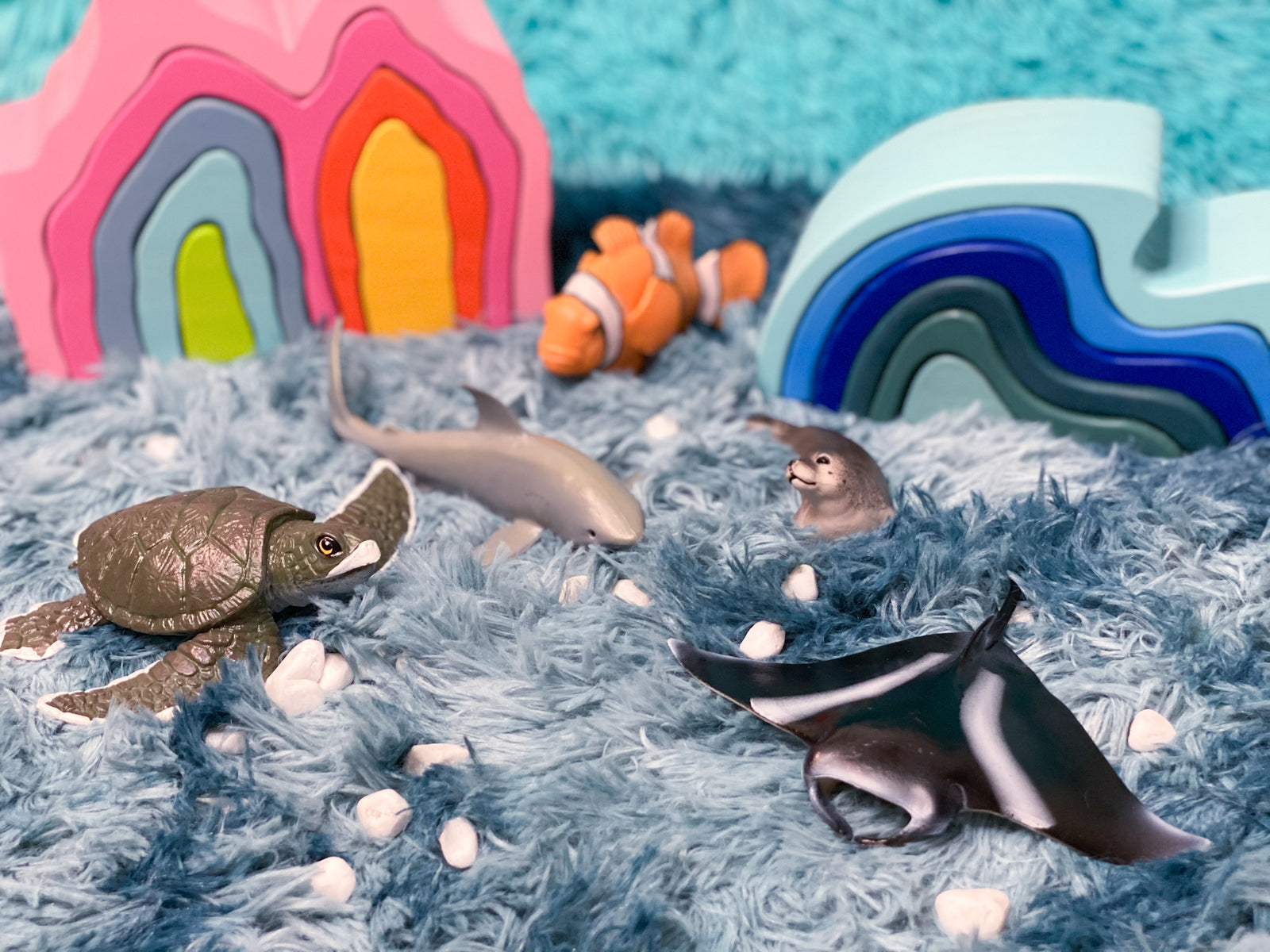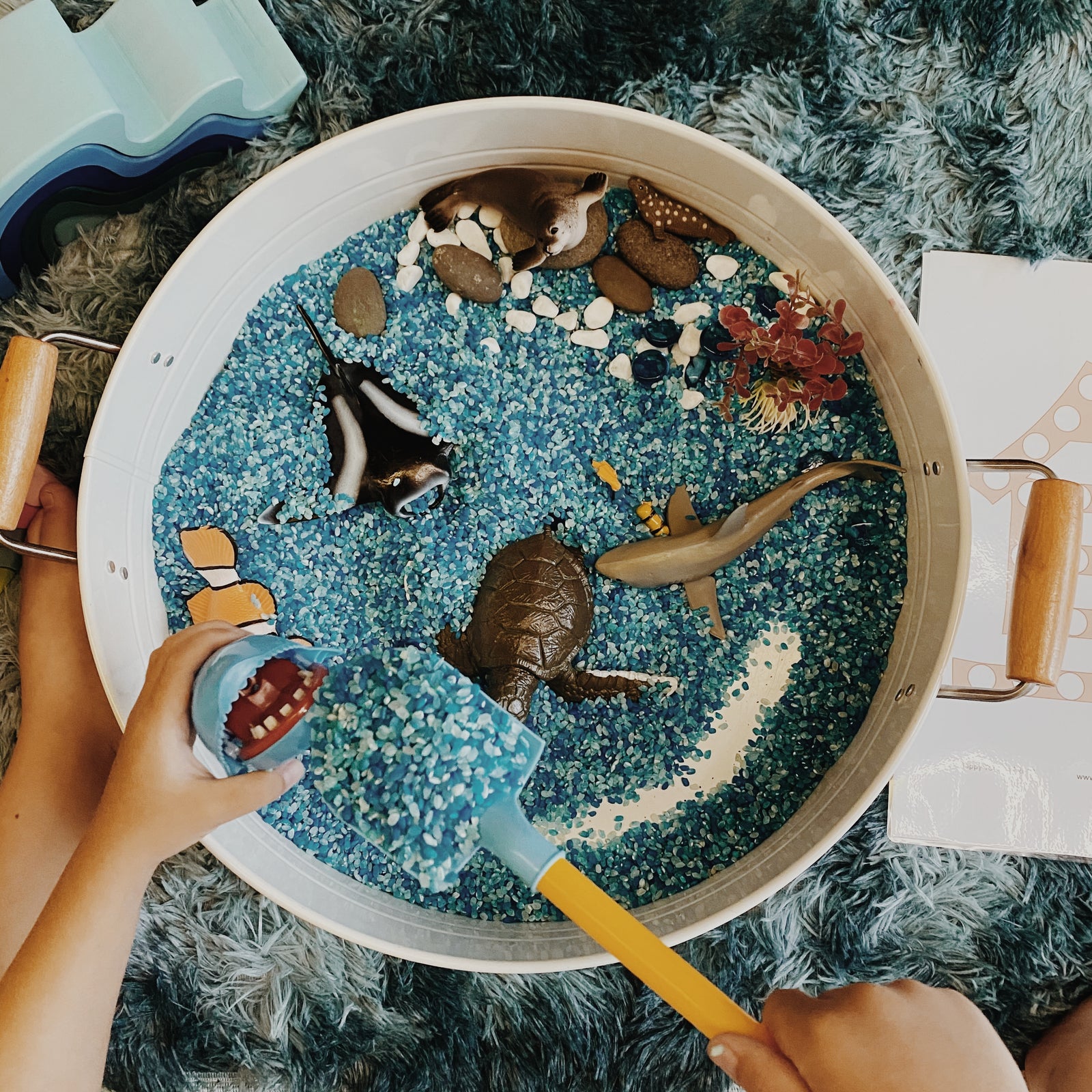 Ocean's one of those sensory play themes we could never get sick of. Besides keeping your child entertained, your child is benefiting from fine motor skills development with all the scooping, pinching and touching. Try this easy set up at home: