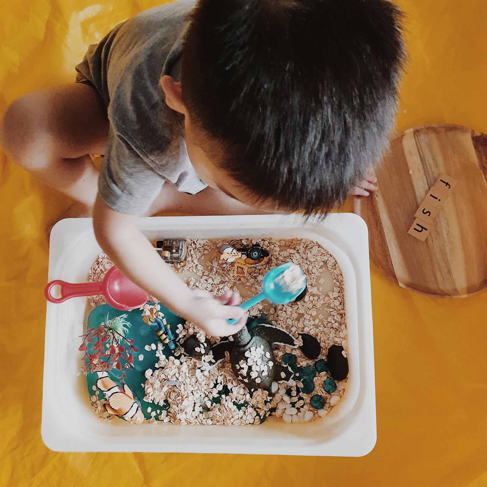 One way to spark a child's interest in literacy is through themed sensory play. Use this chance to incorporate phonics, spelling or getting your child acquainted with Chinese characters.